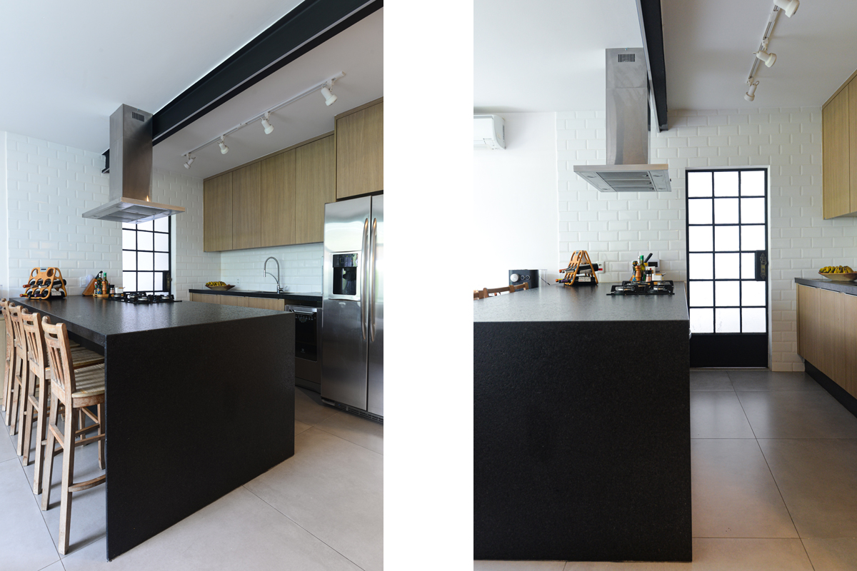 No caso desta península, optamos pelo Granito São Gabriel com acabamento escovado. Foi uma escolha acertada, inclusive pelo custo-benefício, sendo uma rocha nacional de alta durabilidade e beleza.