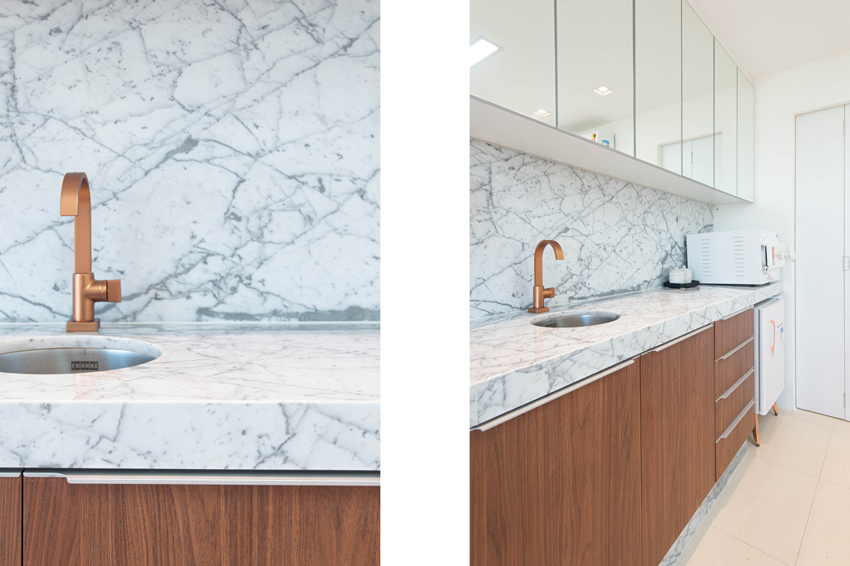 Neste consultório de dermatologia, usamos o Mármore Carrara, extraído na Itália. Ele trouxe elegância e sofisticação ao ambiente. A bancada foi inteiramente paginada, respeitando a continuidade dos veios, o que elevou a qualidade do acabamento.