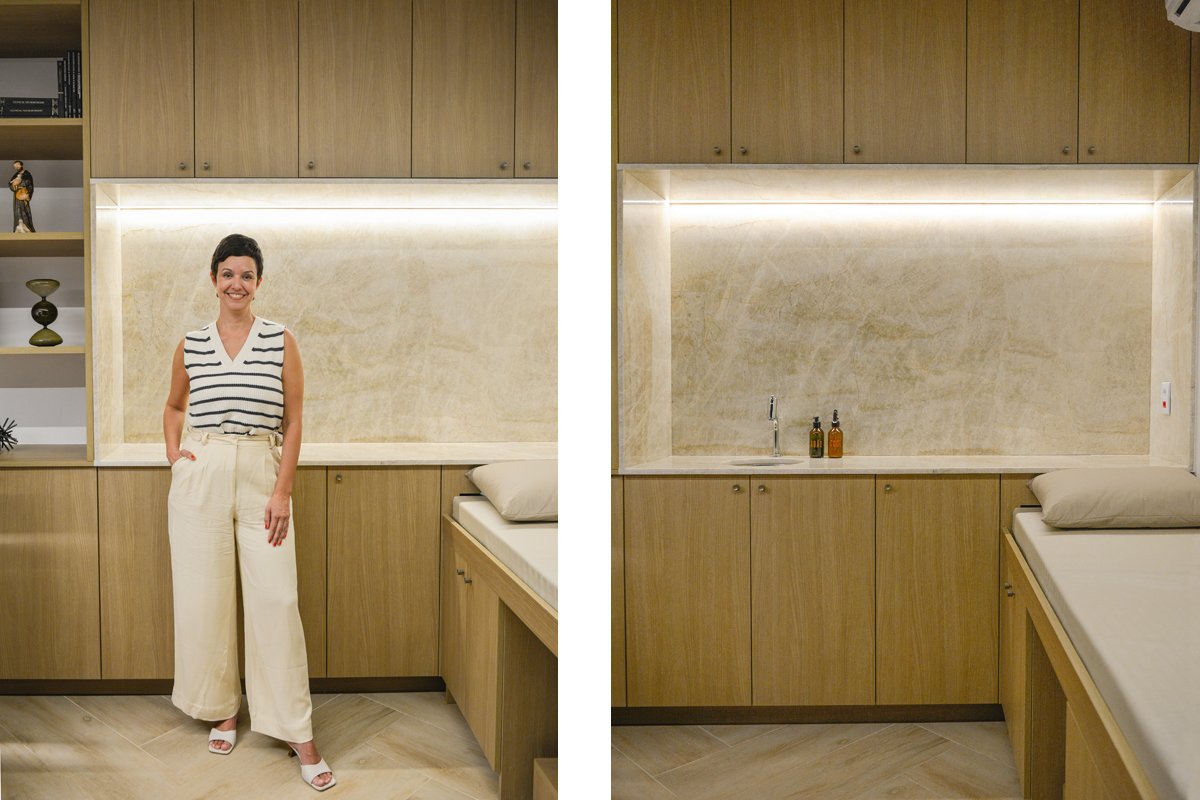 Utilizamos o Quartzito Matira no projeto a seguir, extraído no Nordeste do Brasil. Um dos pontos principais foi a escolha da chapa, garantindo a continuidade dos veios e a estética desejada.