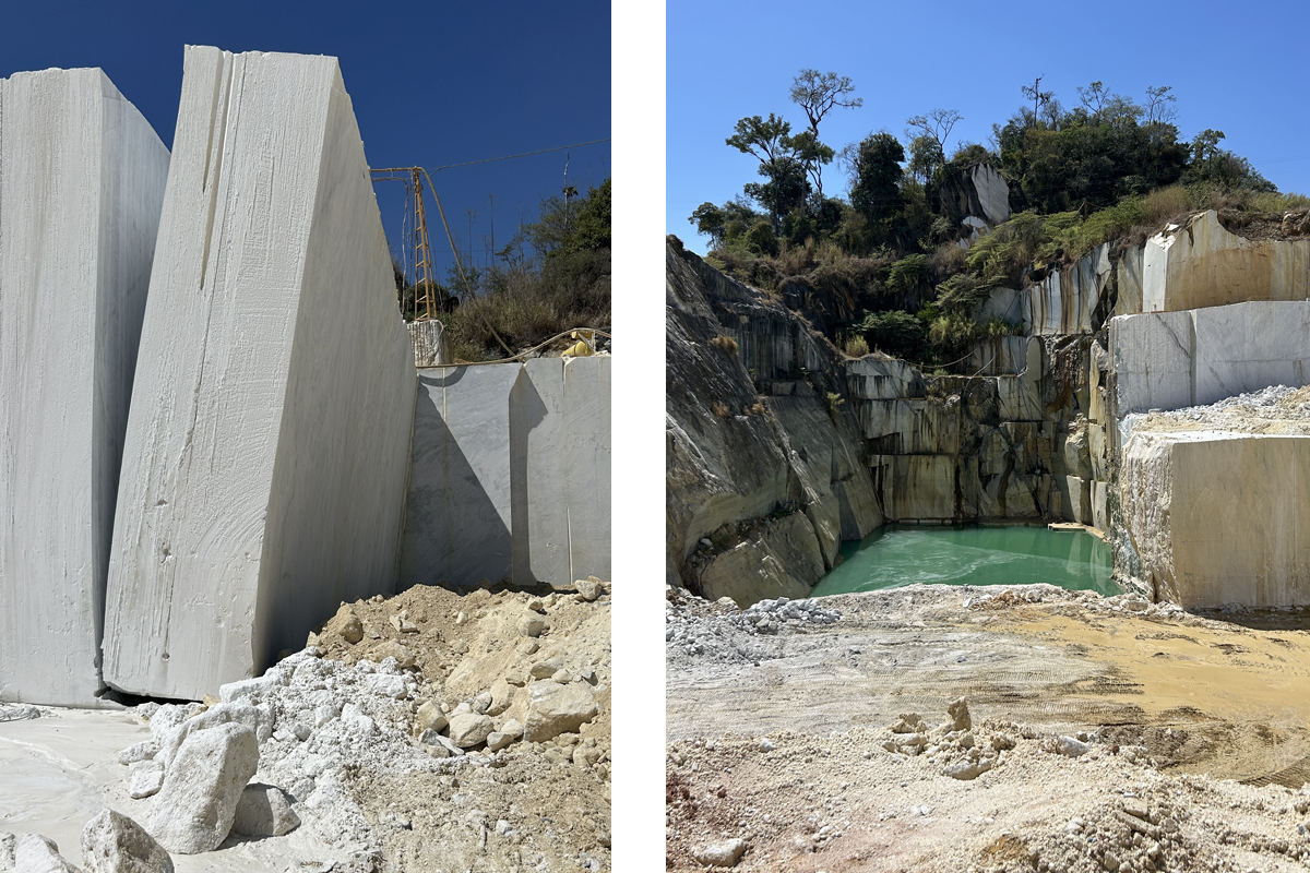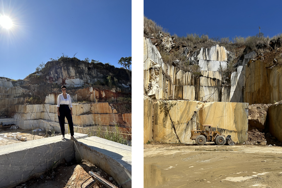 Durante uma visita a uma pedreira, pude ver de perto o processo de extração. Os blocos, depois de extraídos, passam por três etapas de beneficiamento. Primeiro, são cortados em chapas; depois, são telados e resinados para melhorar a estrutura do produto, e só então são transformados em itens prontos para aplicação nas obras.